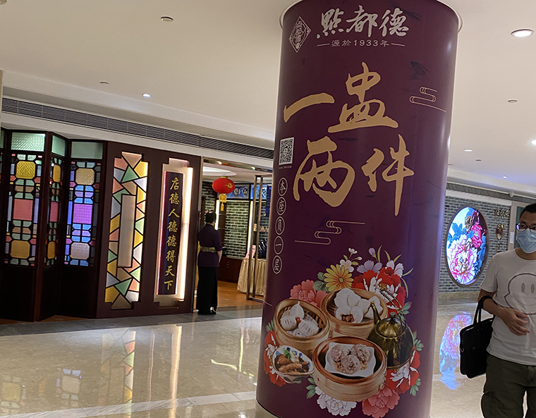 空間中我們則用西關常見的騎樓、灰磚、鑊耳山墻、趟門,把百年傳承的文化韻味裝飾出來,讓消費者身臨其境,感受蘩樓的西關點心文化。這是把