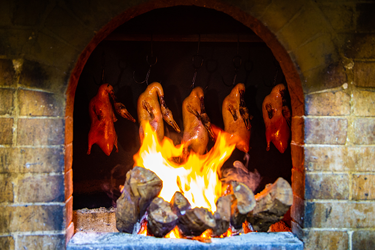 于是,我們推導(dǎo)出這么一條邏輯線:地道的北京烤鴨技法源自宮廷御廚,御廚烤好的鴨子呈現(xiàn)油光明亮的暗紅色,就如同北京故宮的宮墻紅,鮮明奪目。