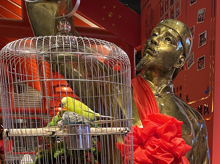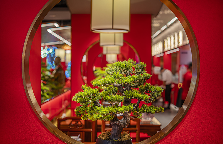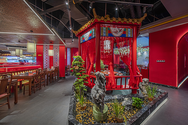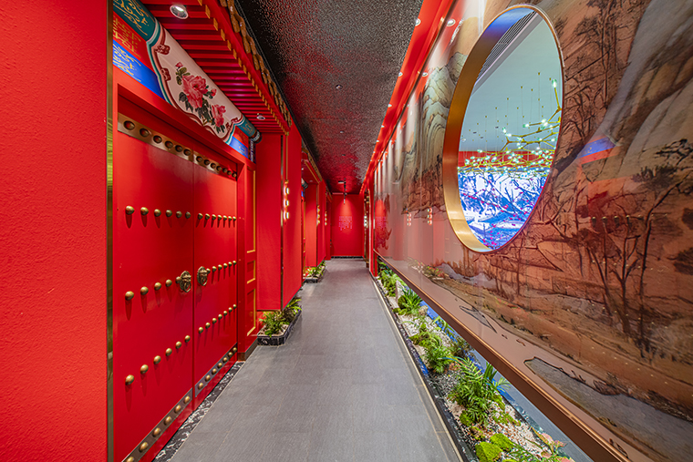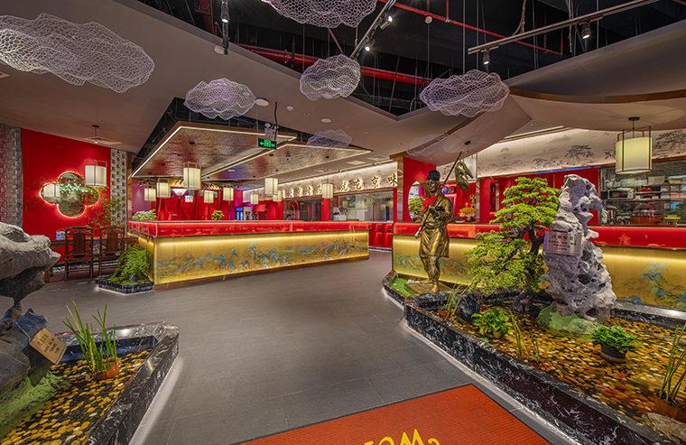 京味張的空間裝飾設(shè)計(jì)大量借鑒了中式園林造景手法,一步一小景、三步一大景,步移景異。用中國(guó)紅強(qiáng)化品牌內(nèi)含的北京皇城文化,令人印象鮮明;門口的迎賓人,提籠遛鳥(niǎo)人,跑堂人等雕塑銅人將老北京烤鴨飲食文化自然帶出;中式園林造景手法,點(diǎn)綴綠植,水景,框景,步移景異;天花的不銹鋼波紋板,一朵朵的祥云裝飾;矮隔斷的千里江山中國(guó)山水工筆畫(huà)造型裝飾,仿佛流動(dòng)的山水國(guó)畫(huà);立面的水晶玻璃磚,暗藏?zé)魩У牟AЦ魯啵臻g中各種不銹鋼收邊條,明檔上的不銹鋼背發(fā)光字,現(xiàn)代裝飾材料與經(jīng)典美食交相輝映,經(jīng)典不失時(shí)尚。
