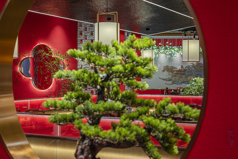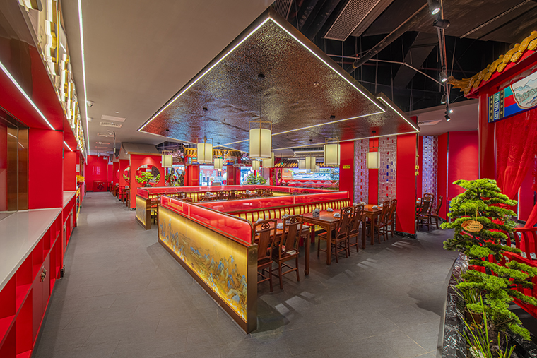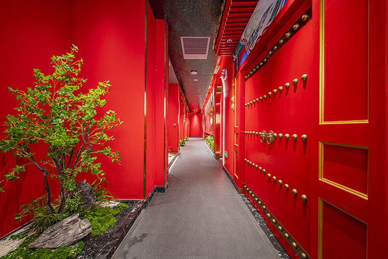 餐廳的地面材料使用的是灰色仿古磚,仿老北京四合院地面灰磚,防滑耐臟,易打理。立面大量使用故宮紅色基底漆涂料,顏色鮮明,極具北京故宮特色;