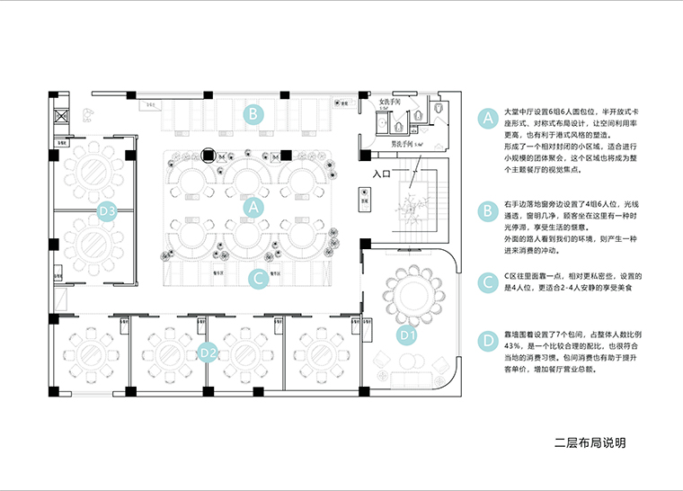 二樓布局以6人桌和包間為主,在內地地區以式熟人關系為主人際關系,多包間隔離式就餐環境,能有效避免不必要人際的羈絆,從而使食客更放松安心就餐。