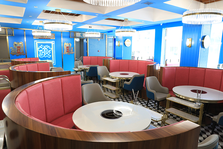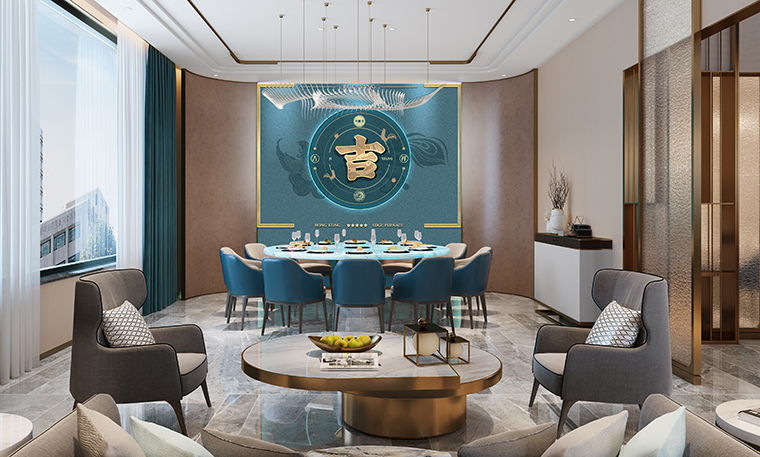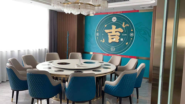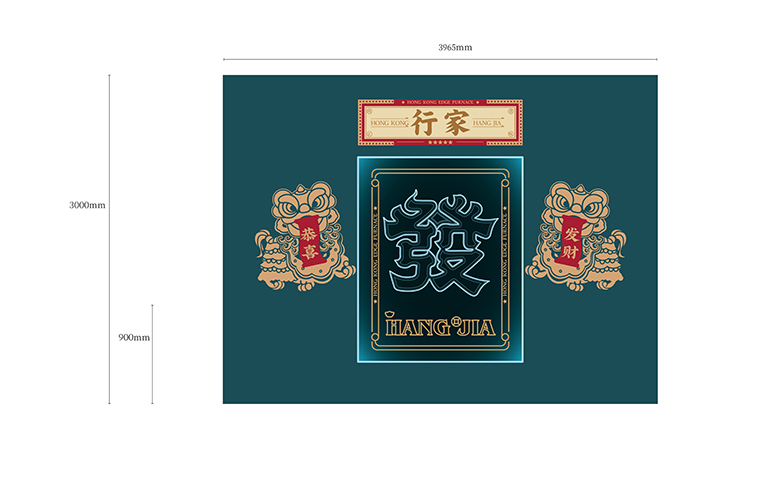 行家花膠雞港式打邊爐餐廳在顏色設計上結合品牌色,大面積使用不銹鋼金色,藍綠色,暗紅色,將餐廳打造成主題風格截然不同的港式餐廳,同時融入具有地域風情的港式風味,在文化元素上植入恭喜發財,順、發、喜等傳統香港吉祥話語元素,傳統與現代的元素融合在餐飲空間中,突破了人們對傳統港式餐廳的認知,重新定義新派港式打邊爐餐廳的基調。