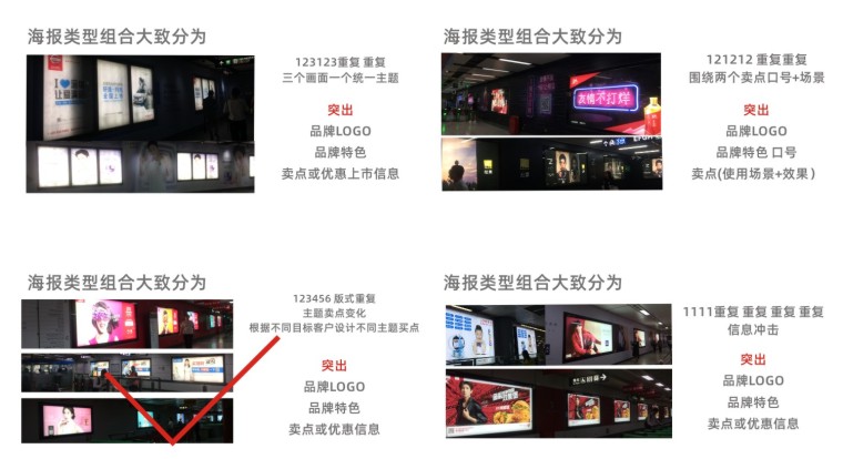 我們選取了(周末時(shí)間+上班時(shí)間)兩天,對(duì)深圳客流密集的多個(gè)地鐵中轉(zhuǎn)站點(diǎn),和幾個(gè)特定時(shí)間段。進(jìn)行現(xiàn)場(chǎng)蹲點(diǎn)觀察,并拍攝了目前1000多張地鐵站現(xiàn)存的海報(bào)圖片實(shí)例。通過(guò)對(duì)海報(bào)圖片的分類(lèi)整理,地鐵站客流對(duì)廣告關(guān)注度點(diǎn)的觀察。最終團(tuán)隊(duì)投票選取出印象最深且能傳達(dá)品牌信息的多張地鐵站品牌海報(bào)進(jìn)行廣告?zhèn)鞑ピ砑霸O(shè)計(jì)原理逆向推理分析: