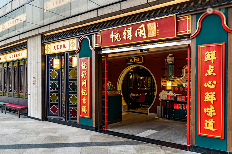 與此同時,在深圳市場由品深餐飲全案策劃設計的悅得閑茶樓第六家店(龍華壹方天地A區3樓3005號)也在7月21號迎來了正式開業。悅得閑廣式點心茶樓,全深圳第6家,來到了龍華區,它奢侈的將西關大宅“搬”進來,讓人感受到最具老廣味的、最雅致的嘆茶生活。依然保持了品深餐飲設計既定的大紅配大綠的形象風格和文化體系,滿眼都是紅磚綠瓦,拱門回廊、傳統高雅也不失格調的裝飾,讓人眼前一亮。此次還加入了復古特色的大戲臺,處處都散發出一股濃厚的西關茶樓風情,可以一秒化身為西關小姐,在此和三五好友嘆茶談笑風生。