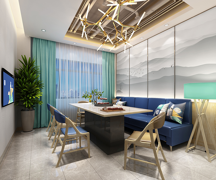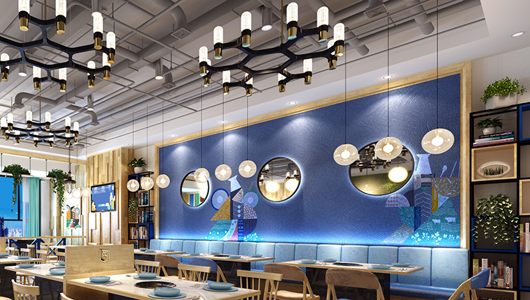 品深餐飲設計在整個空間裝飾設計中,我們貫徹“讓消費者能放松心情,享受美食,有情懷,有情調,有趣味”。通過空間中大面積天空藍的使用,與我們傳達的新鮮,干凈、現拌的出品特質完美契合,使用藍色刻意營造舒適,純凈的用餐氛圍;