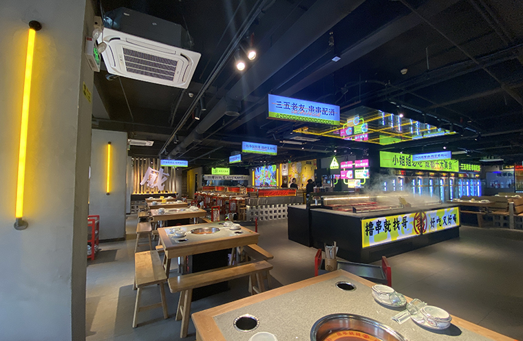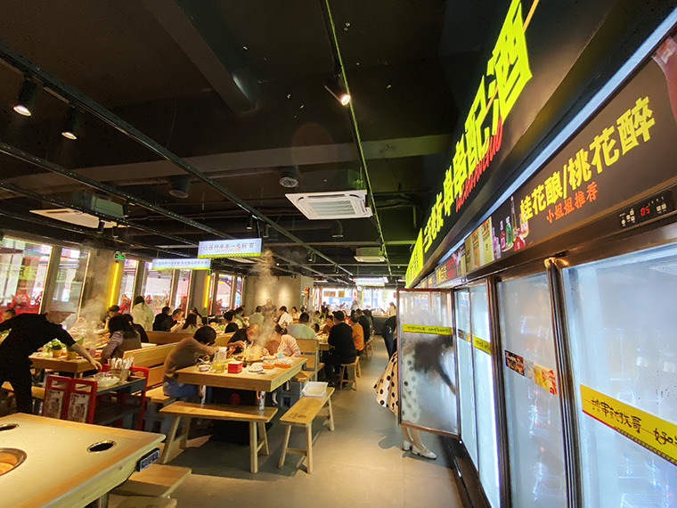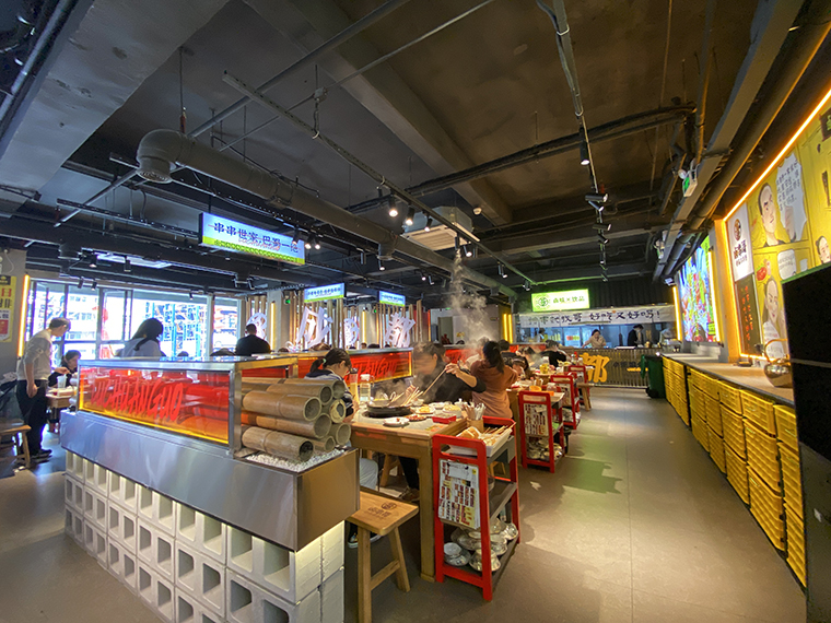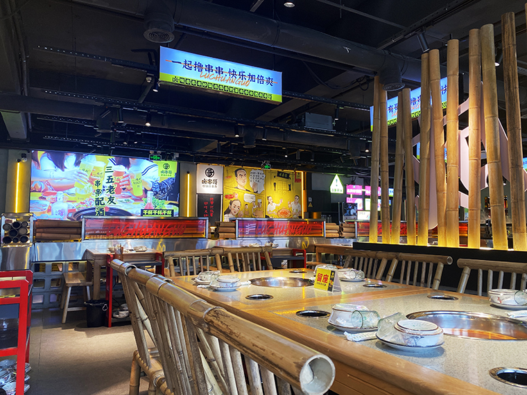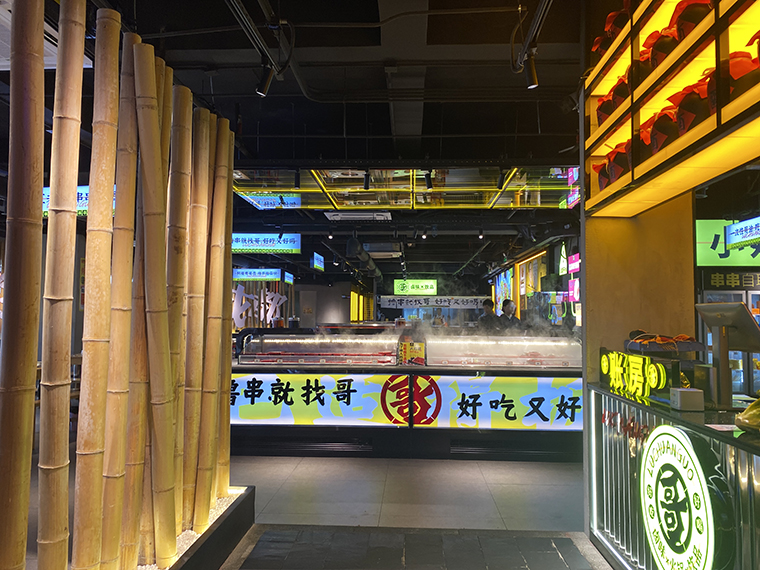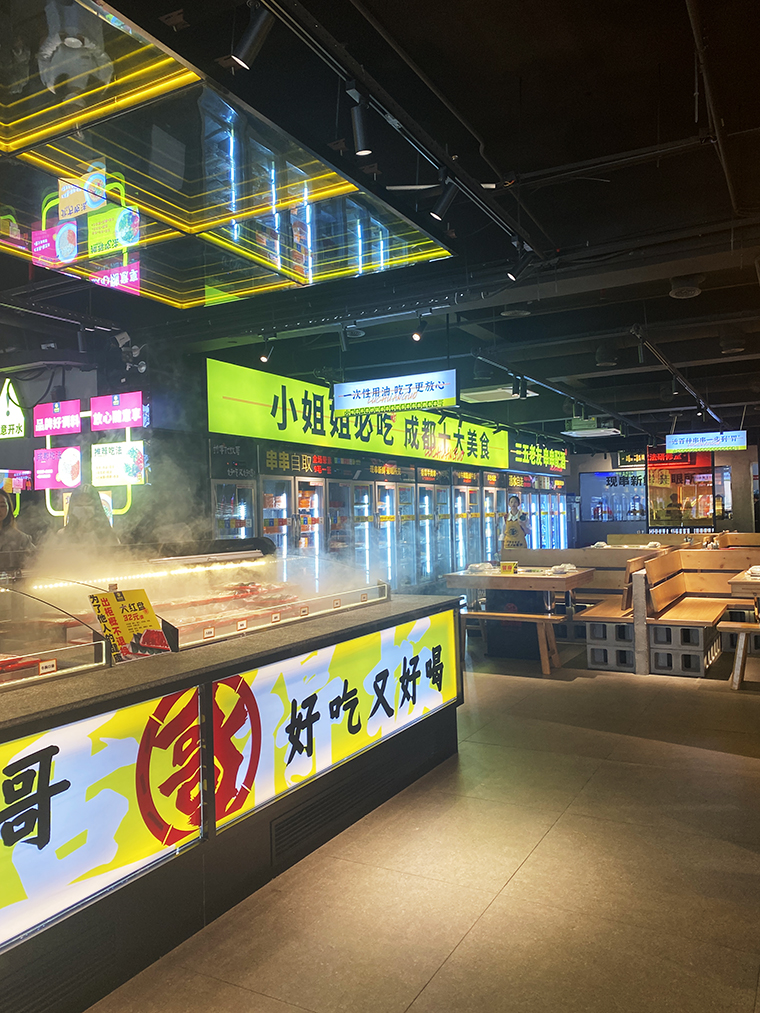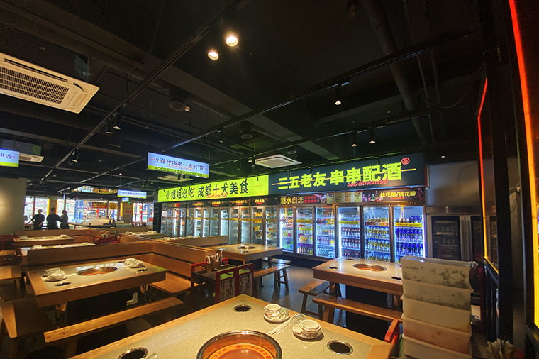 串串香火鍋的用餐特點(diǎn)比較獨(dú)特,類(lèi)似自助火鍋。顧客自己到冰柜取串串,拿飲品,喜歡什么就拿什么。因此,在門(mén)店功能設(shè)計(jì)方面,取串串的冰柜是客流最密集的地方,需要給顧客展示出串串品類(lèi)特別多的優(yōu)勢(shì)。