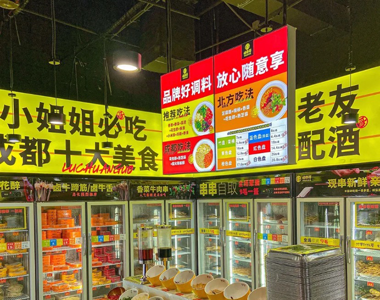 4、空間門(mén)店中最醒目的就是取串串的一長(zhǎng)溜冷鮮柜,甲方團(tuán)隊(duì)希望多用廣告畫(huà)面展示菜品賣(mài)點(diǎn),各種酒水飲料等。我們則認(rèn)為放菜品畫(huà)面太小,傳播力很弱,圖片也分散,關(guān)注度更低。我們直接用一句話語(yǔ)來(lái)傳達(dá):小姐姐必吃成都十大美食。既討巧了我們的主流客群,也用成都這一大IP來(lái)背書(shū)。很特別,很震撼,效果當(dāng)然更好。其他需要傳達(dá)的信息如產(chǎn)品價(jià)格、產(chǎn)品核心賣(mài)點(diǎn),我們都用背膠貼的形式,貼在冷鮮柜門(mén)上,廣告效應(yīng)顯著。