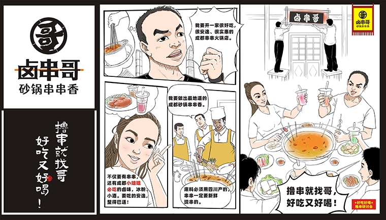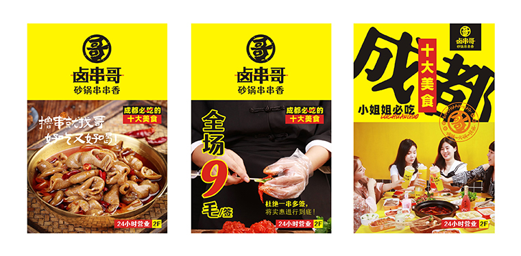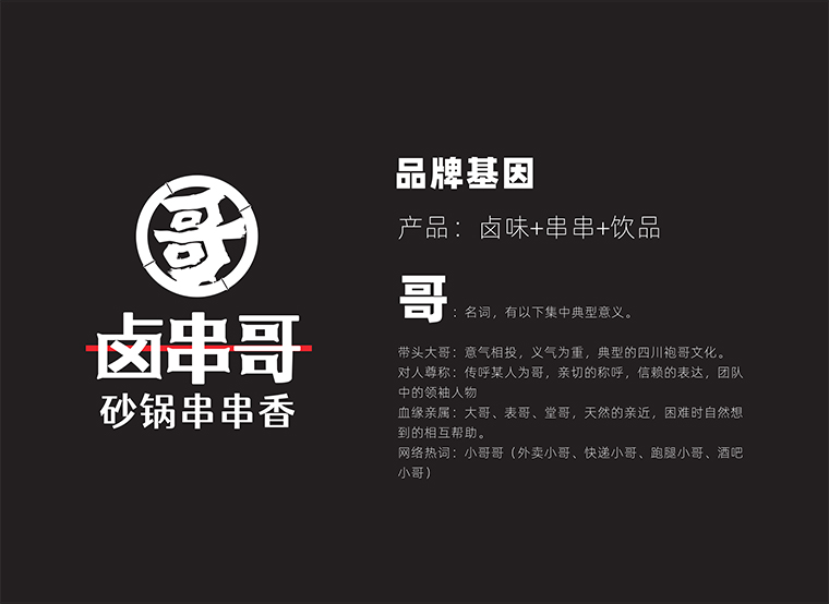 我們從鹵串哥品牌內(nèi)在基因出發(fā),提取升華了哥的文化,哥的符號(hào)。哥在四川既是表達(dá)親切信賴,尊重,也是袍哥文化,江湖義氣的表達(dá);同時(shí)哥還是負(fù)責(zé),擔(dān)當(dāng)?shù)囊庀?;哥還與當(dāng)下外賣小哥、快遞小哥、餐廳服務(wù)小哥的一種親切稱呼。