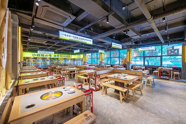 3、為了表現(xiàn)成都串串香火鍋店的市井氣息,我們?nèi)サ袅说蹴?,減少立面造型,墻體使用了水泥面,還原出老成都串串香火鍋店的場(chǎng)景氣質(zhì),家具使用木質(zhì)卡座與條凳八仙桌,竹椅,此次門店還創(chuàng)造性地沒(méi)有使用吊燈,僅使用軌道射燈,整個(gè)空間硬裝修造價(jià)不到800元每平方米,是后疫情時(shí)期餐飲門店裝修投資最好方向。