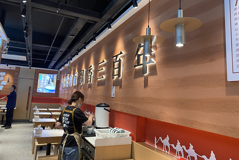 1、整個空間圍繞饸饹面是西北的小吃,在墻面的裝飾材料上用了能代表西北地貌特色的黃土高原涂料,顏色暖黃極像黃土。進入門店,仿佛置身于大西北的某個面館,讓顧客產生了品牌的認同。